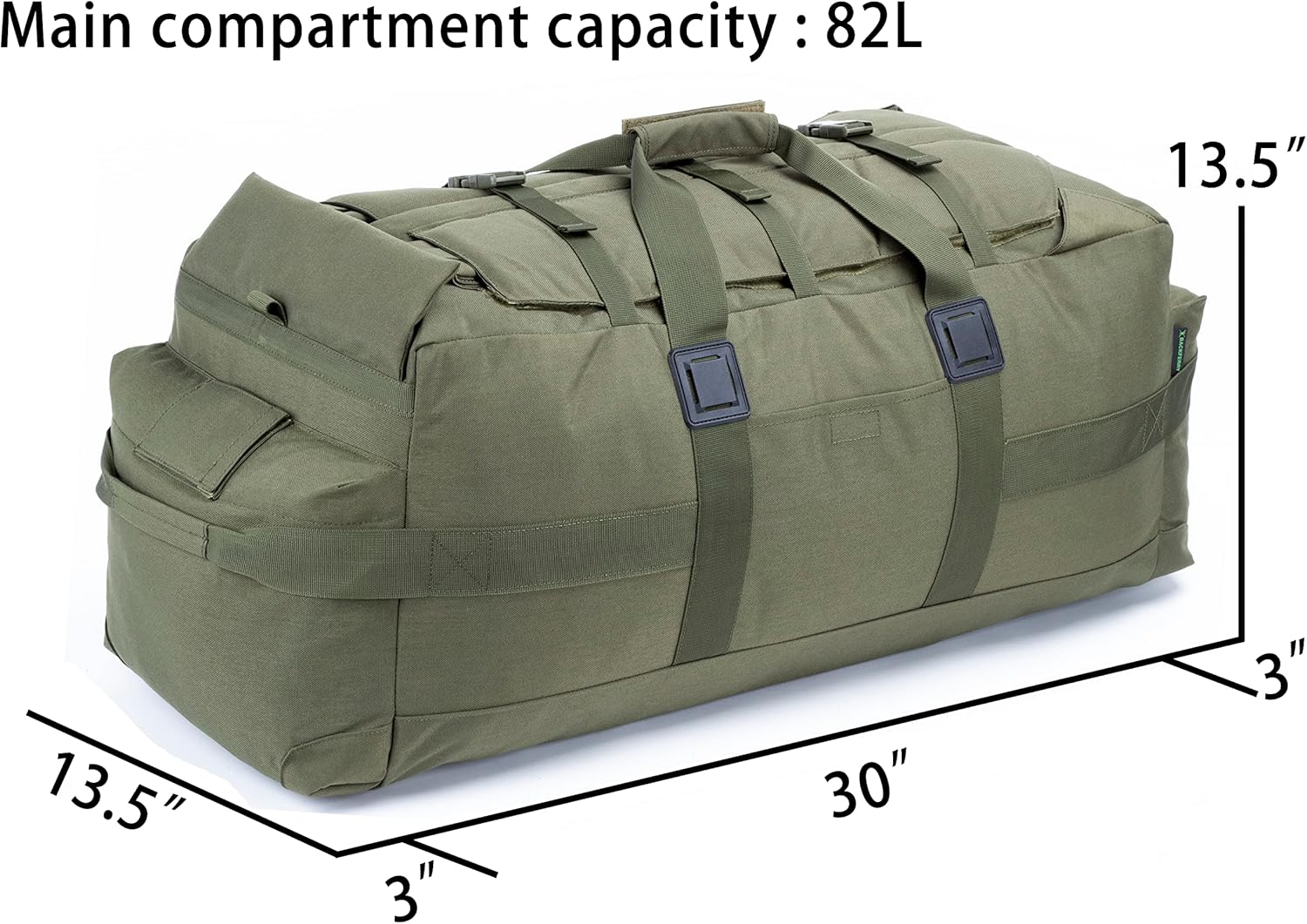 - This extra large military style duffle bag backpack could be used as emergency go bag, EMS bag, deployment bag, load out bag, holdall bag, carryall bag, as well as sports gym bag and bugout bag.