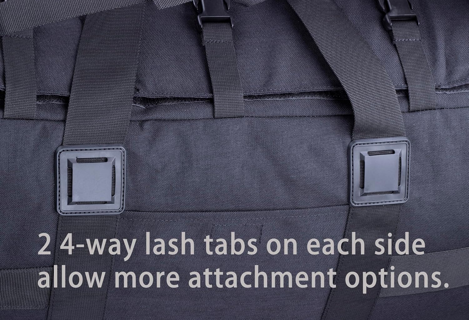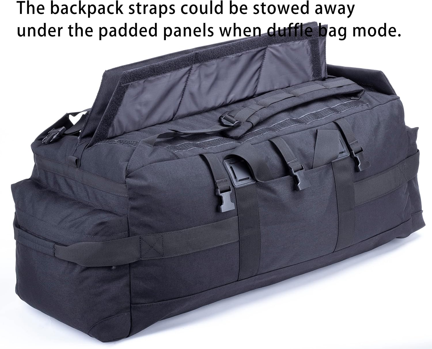 - Padded backpack style straps with sternum strap and padded top panels for comfortable backpack mode carrying. The backpack straps could be stowed away under the padded panels when duffle bag mode. 2 plastic lash tabs on each side for gear attaching.