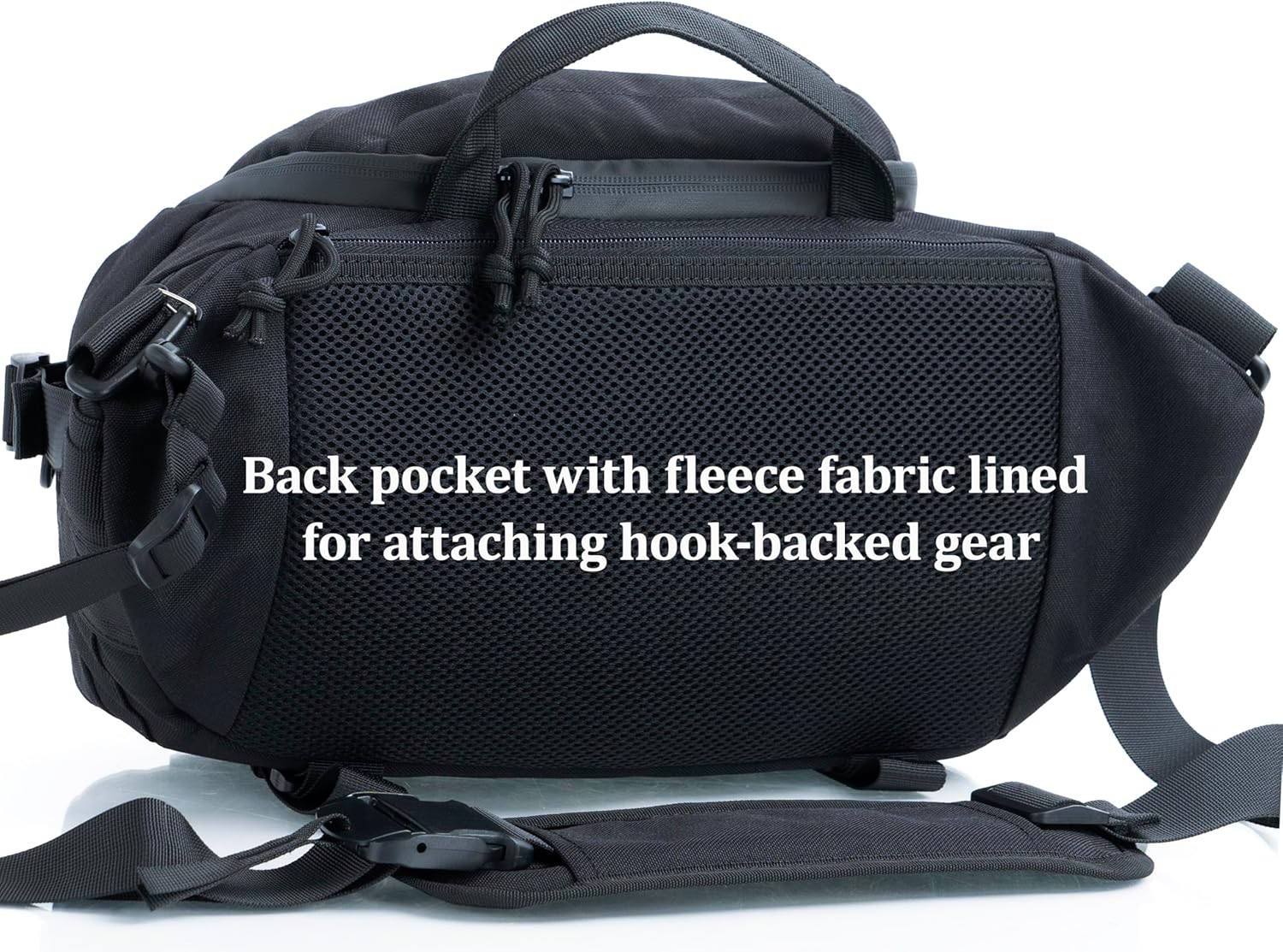 - This solid sling backpack features : one main compartment with one sleeve pocket and one interior zipper pocket. Main compartment is around 7 liters. One mesh pocket built inside the bag lid. One small zipper pocket on top for quick access your small loose items such as smartphone, glasses, small tools, etc. One zipper pocket on front panel with 2 sleeve pockets inside. One slim compartment on back panel with fleece fabric linded for hoook-back gear.